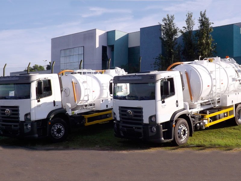 Frota própria de caminhão limpa fossa, hidrojateamento, e caminhoneta mini hidro e vácuo. Veículos equipados com bombas de sucção de anel líquido e bombas de alta pressão e vazão.